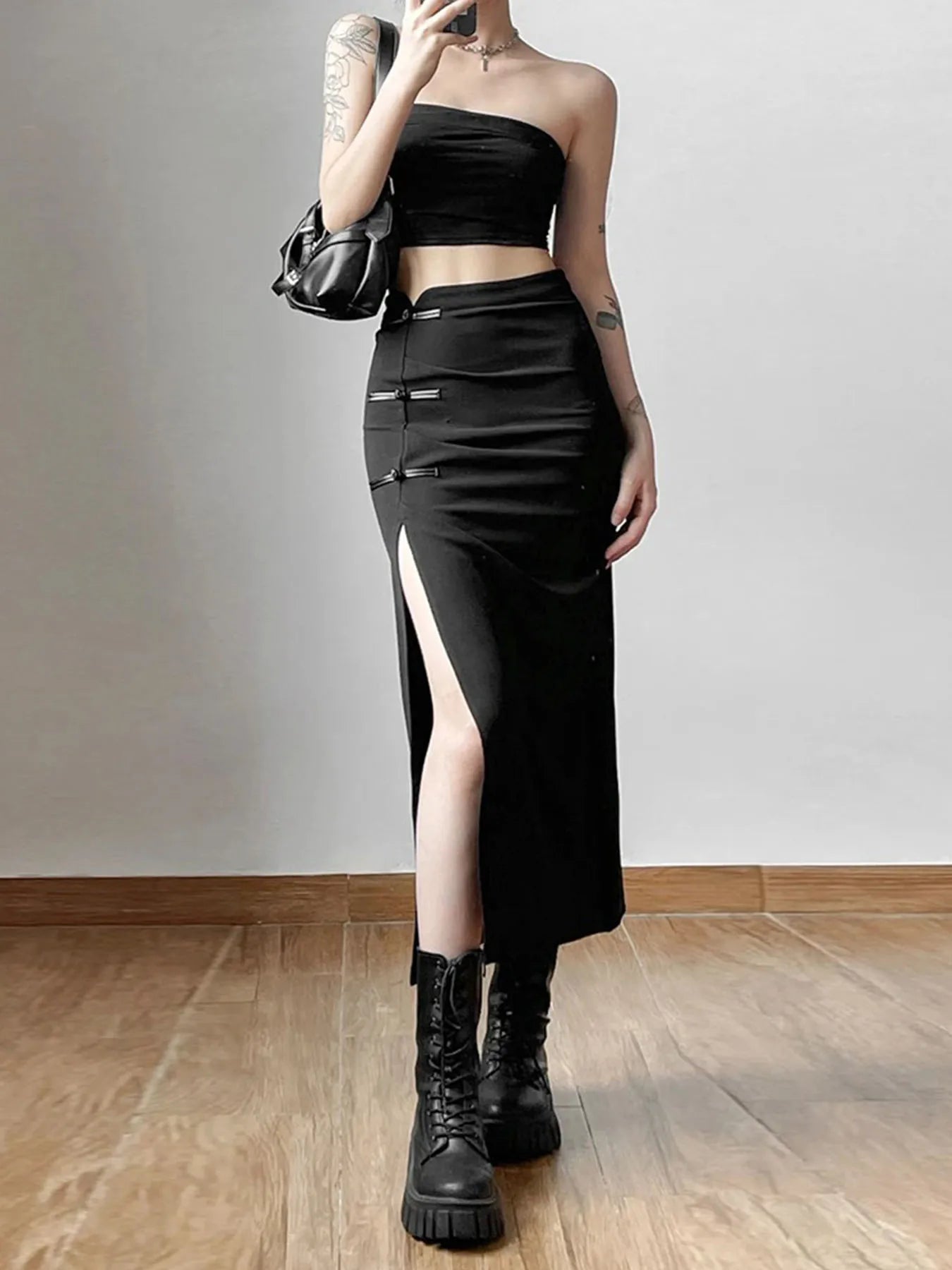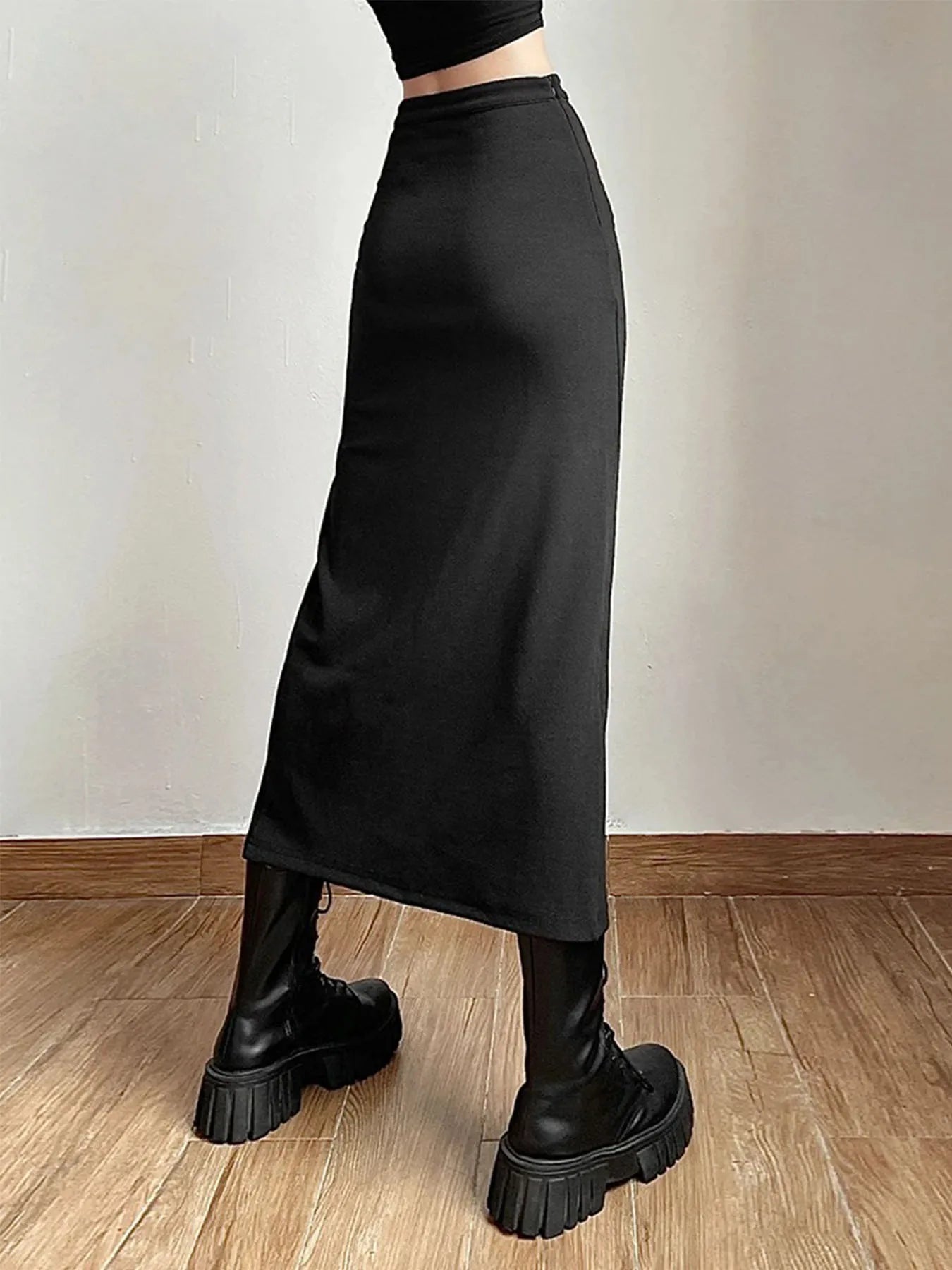 Black Sexy Split Simple Casual All-Match Hot Street Outing Cool Mature Vitality Personality Trend Basic Women'S Skirt