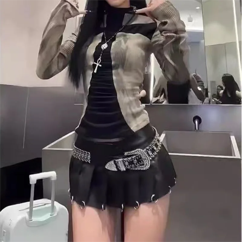 Women Y2k Clothing Ribbed Tops Vintage Harajuku Cross Print T-shirt Grunge Aesthetic Long Sleeve Patchwork Tops Trend 2000s